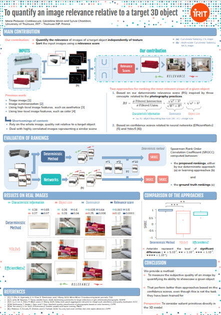 This poster, presenting results that earned the best contribution award at GTMG 2022, details a method for quantifying the visual relevance of a 2D image in showcasing a 3D object.
